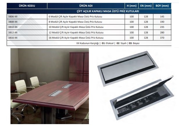 NE-AD 3666-XX 16 Modül Çift Açılır Kapaklı Masa Üstü Priz Kutusu (Renk-Eloksal)