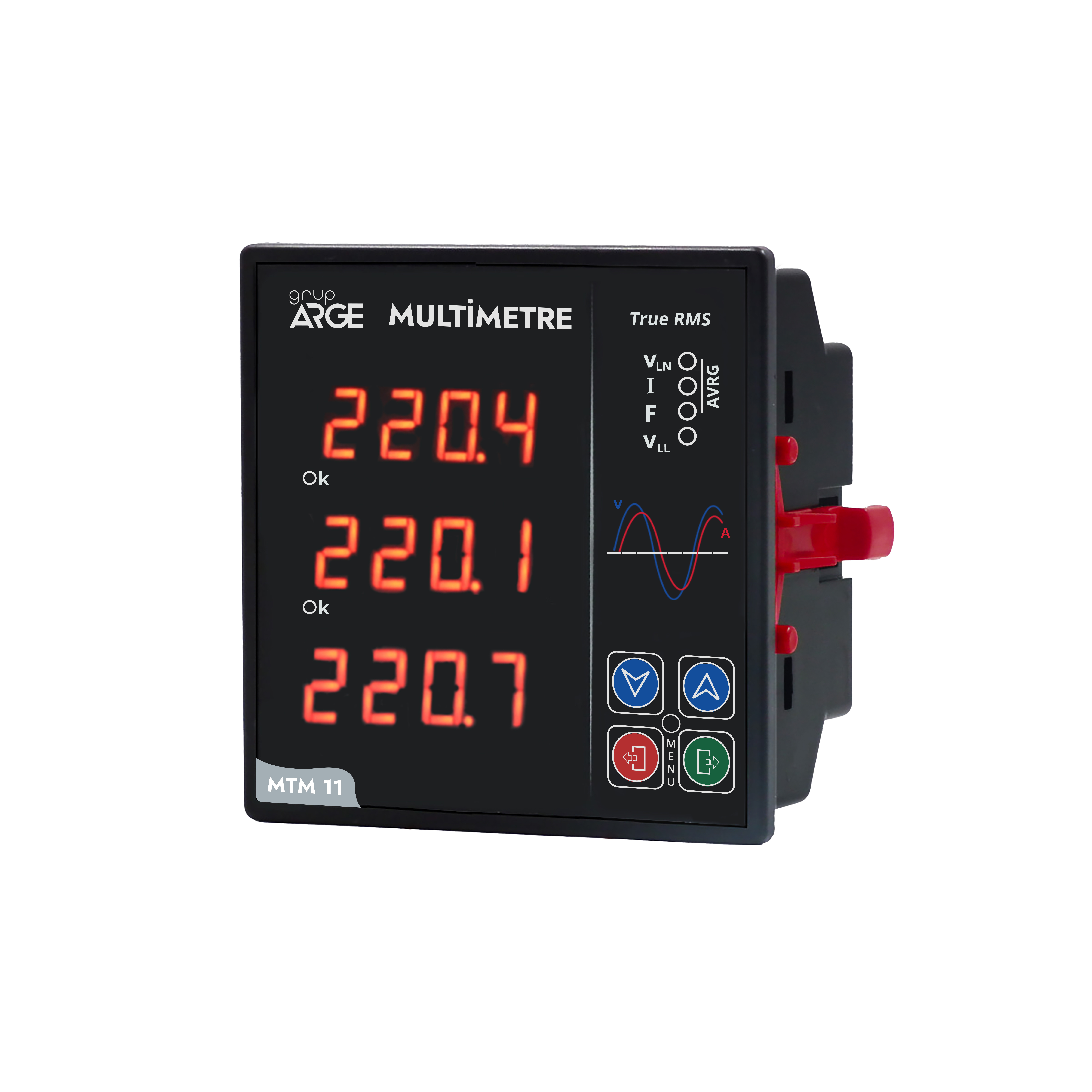 - Multimetre isimli ürünümüz, akım, gerilim (faz-faz), gerilim (faz-nötr), frekans, kontrol çıkışları, menü, k (x1000) LED’lere sahiptir.