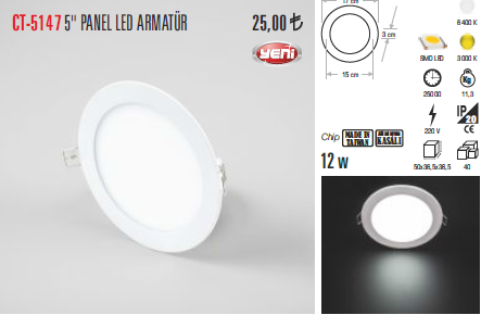 - Led Panel Armatürü Saç Kasa 12 Watt 6400K (Yuvarlak)(Beyaz Işık)