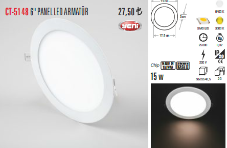 - Led Panel Armatürü Saç Kasa 15 Watt 6400K (Yuvarlak)(Beyaz Işık)