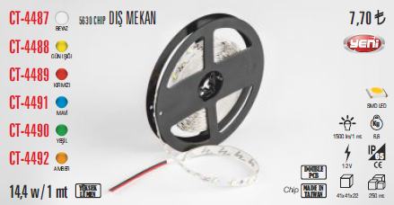 CATA Şerit Led Dış Mekan 14,4W 5mt Beyaz Işık Rengi 5630 SMD çipli (CT-4487)